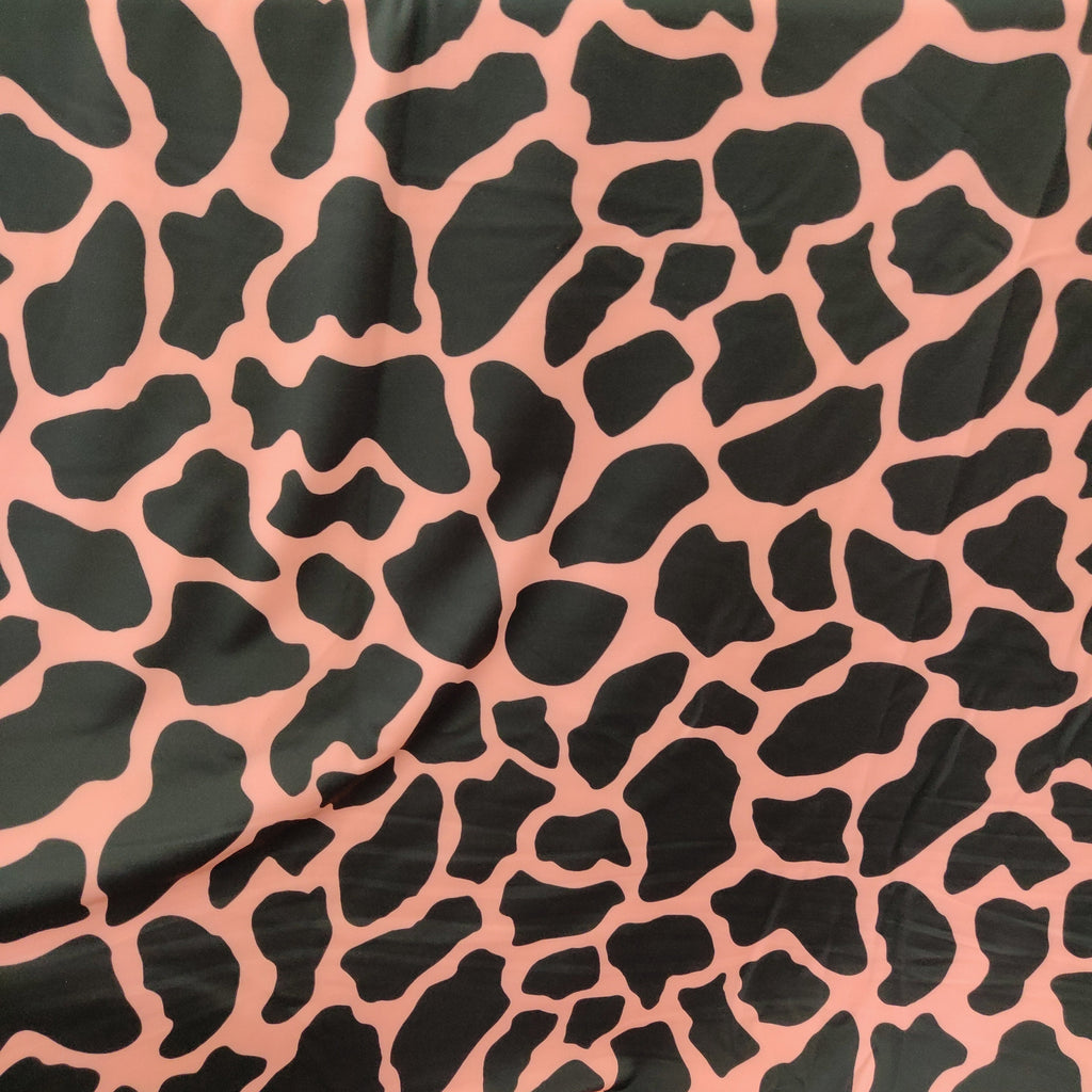 This showcases one of our animal prints collection with the cow print. These cow print fabrics have such unique and intricate patterns. Definitely if your a big animal lover you'll fall in love with this particular cow print as it keeps it plain and simple. This beautiful material is sure to turn head on the red-carpet or at your special event. You can use it for any type of apparel but these are usually fan favorites for individuals making gowns, prom dresses, and gala wear.