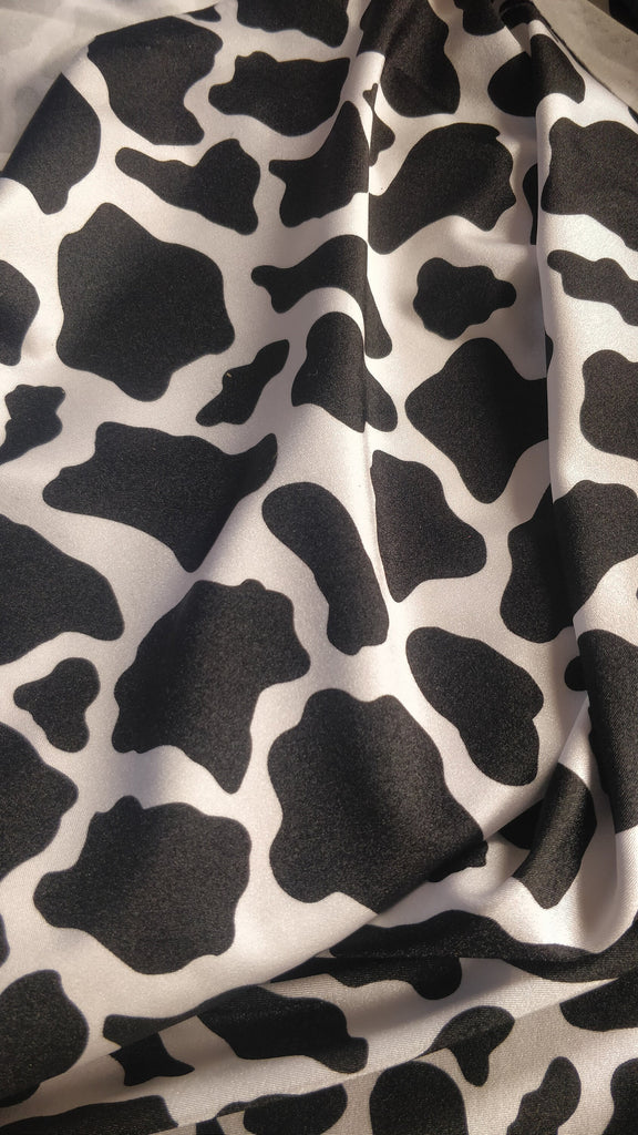 This showcases one of our animal prints collection with the cow print. These cow print fabrics have such unique and intricate patterns. Definitely if your a big animal lover you'll fall in love with this particular cow print as it keeps it plain and simple. This beautiful material is sure to turn head on the red-carpet or at your special event. You can use it for any type of apparel but these are usually fan favorites for individuals making gowns, prom dresses, and gala wear.