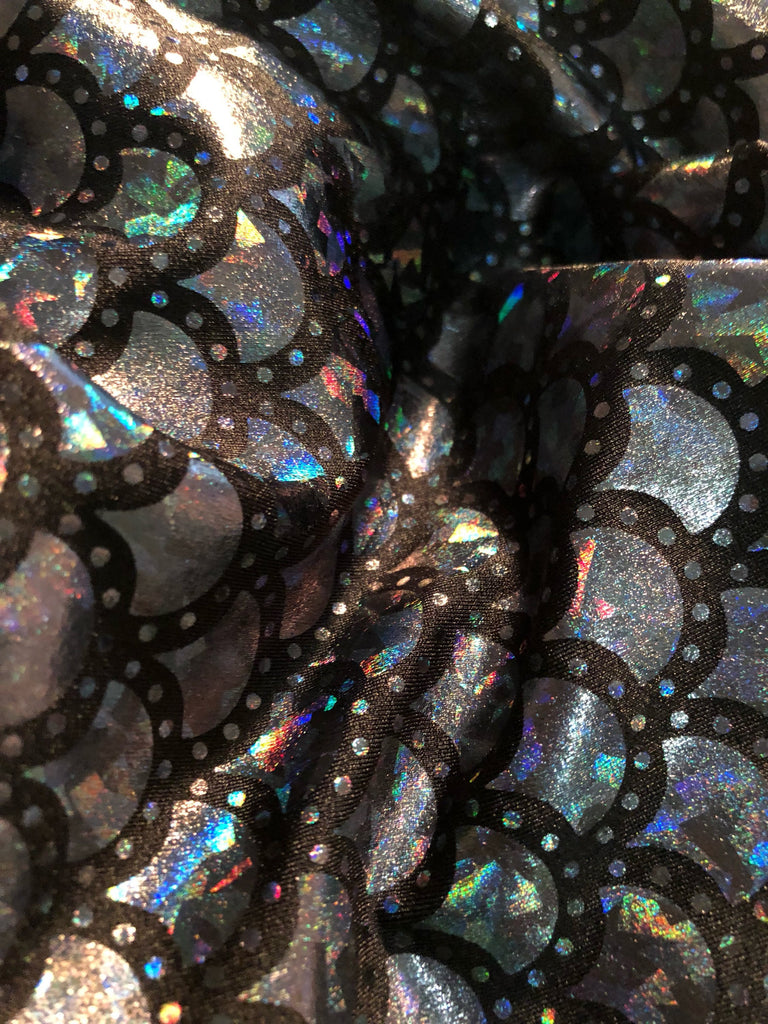 Silver & Black Mermaid Fish Scale on Hologram Foil Spandex w/ Dots Fabric (4 Way Stretch/Per Yard)