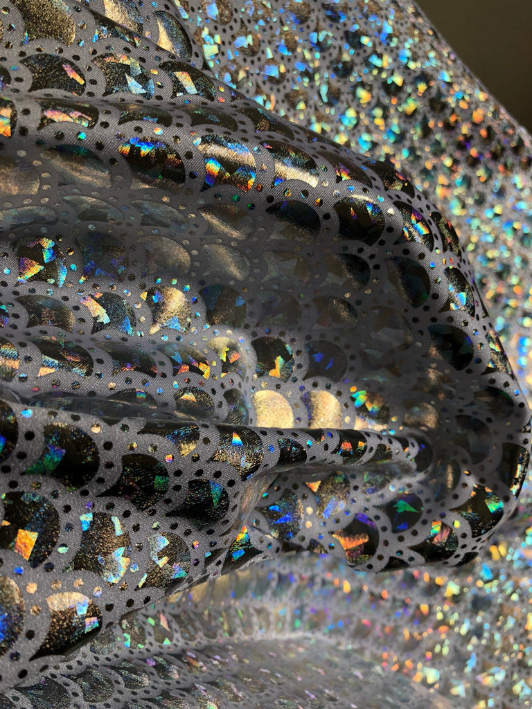 Silver & White Mermaid Fish Scale on Holographic Foil Spandex with Dots Fabric (4 Way Stretch/Per Yard)