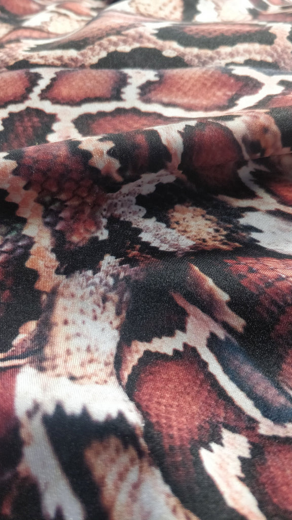 This showcases one of our animal prints collection with the snake skin print. These snake skin print fabrics have such unique and intricate patterns. Definitely if your a big animal lover you'll fall in love with this particular snake skin print as it keeps it plain and simple. This beautiful material is sure to turn head on the red-carpet or at your special event. You can use it for any type of apparel but these are usually fan favorites for individuals making gowns, prom dresses, and gala wear.