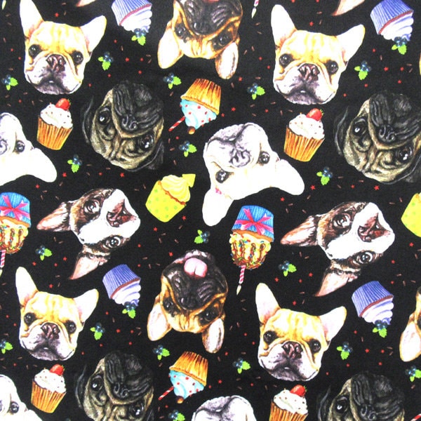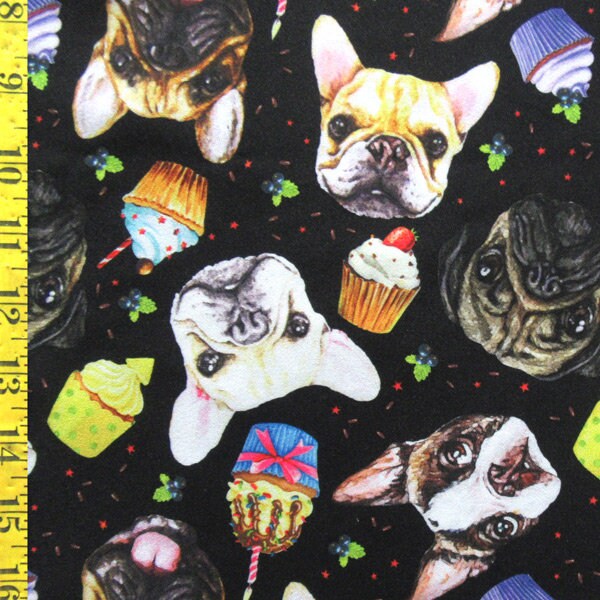Pugs and Cupcakes Printed on Poly Spandex Fabric (Black) (4 Way Stretch/Per Yard)