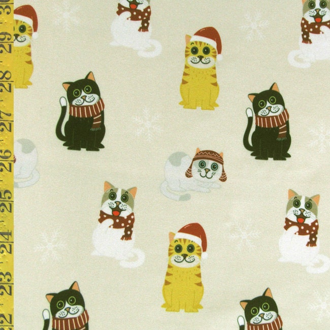 Merry Christmas Cat Print on Poly Spandex Fabric (Light Ivory) (4 Way Stretch/Per Yard)