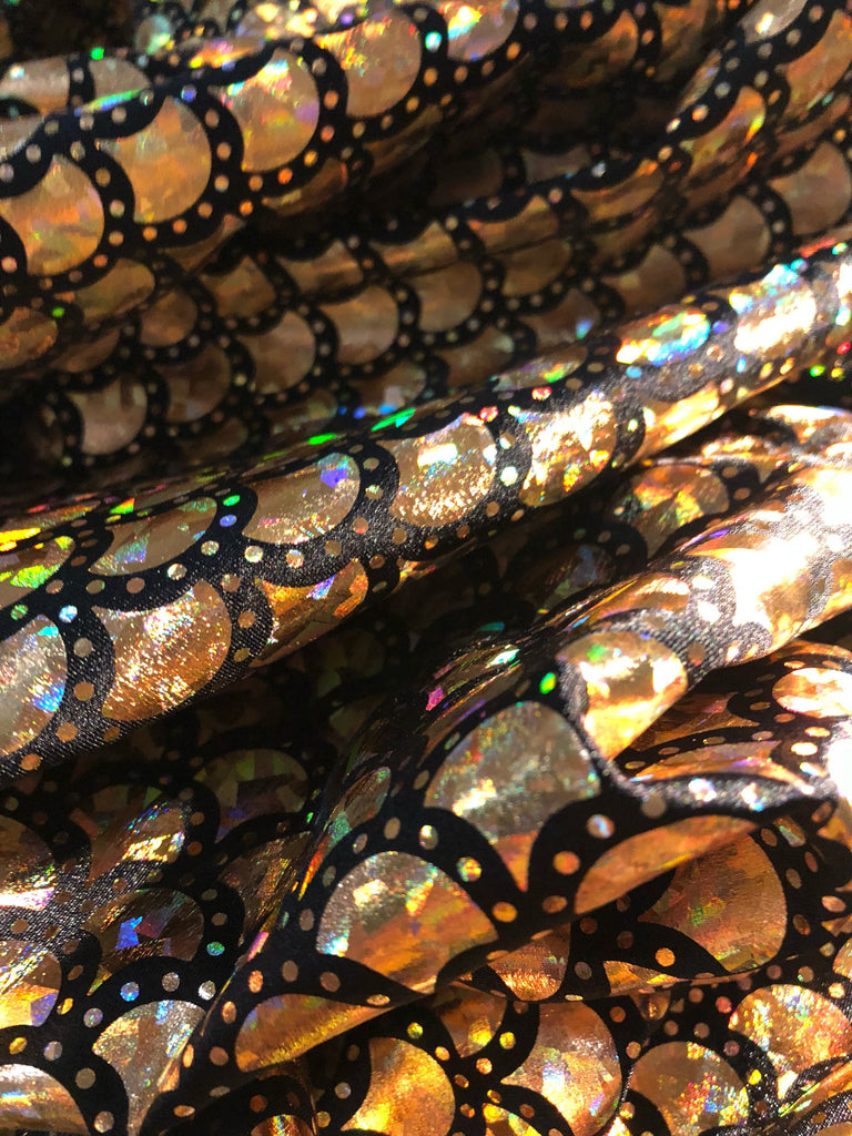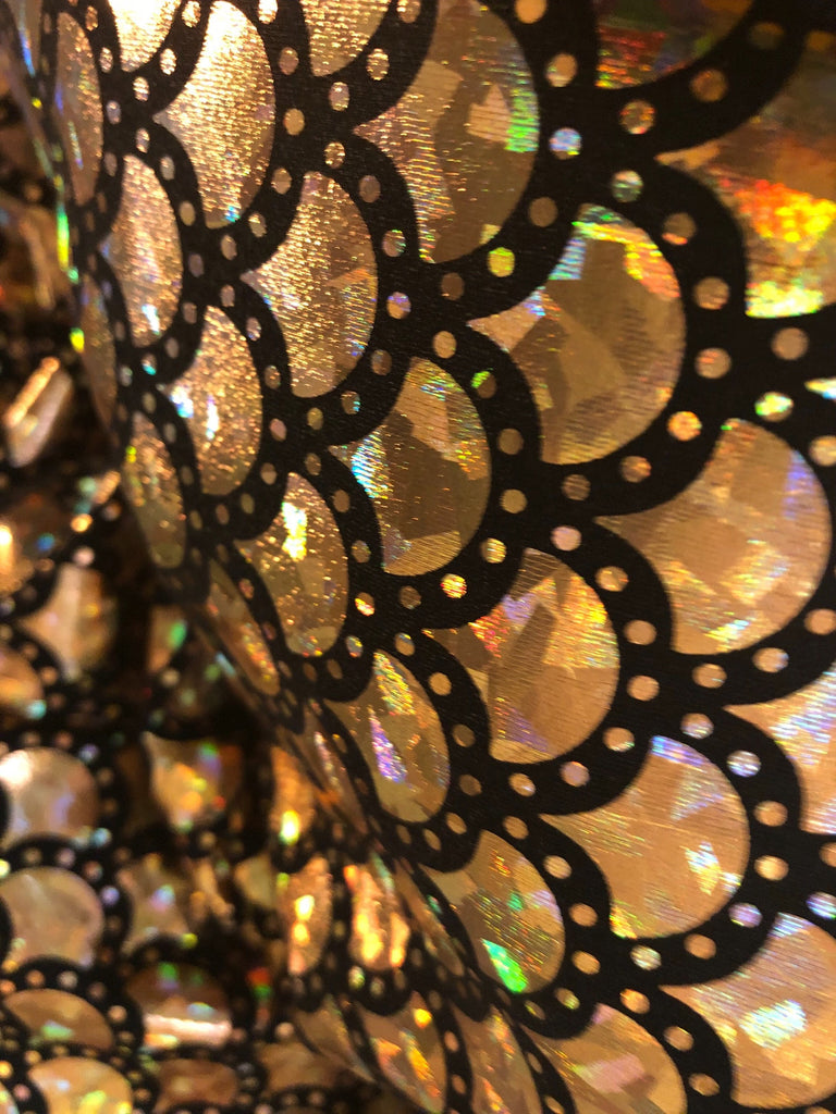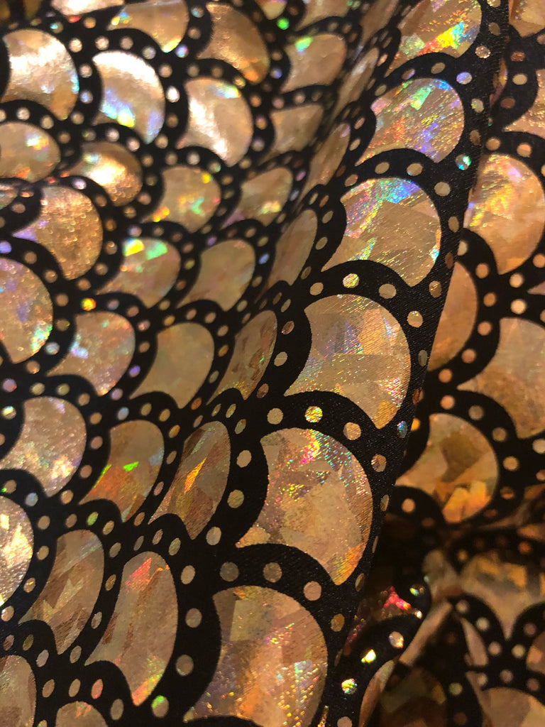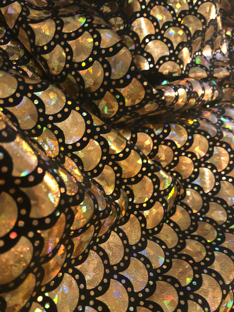 Gold & Black Mermaid Fish Scale on Hologram Foil Spandex w/ Dots Fabric (4 Way Stretch/Per Yard)