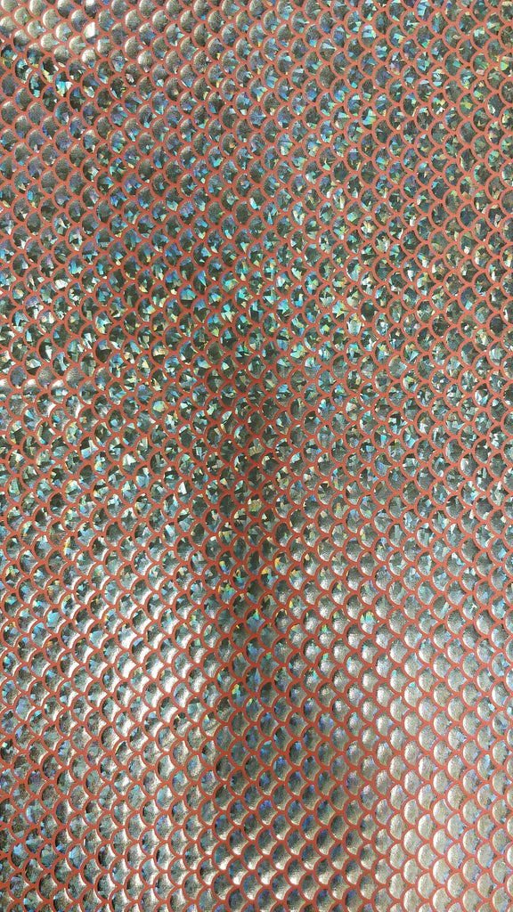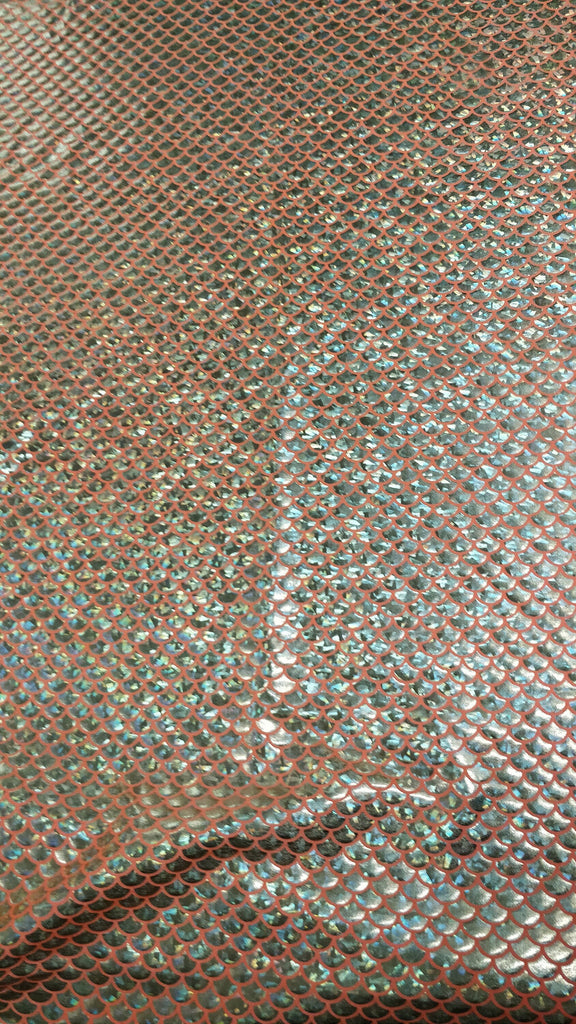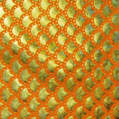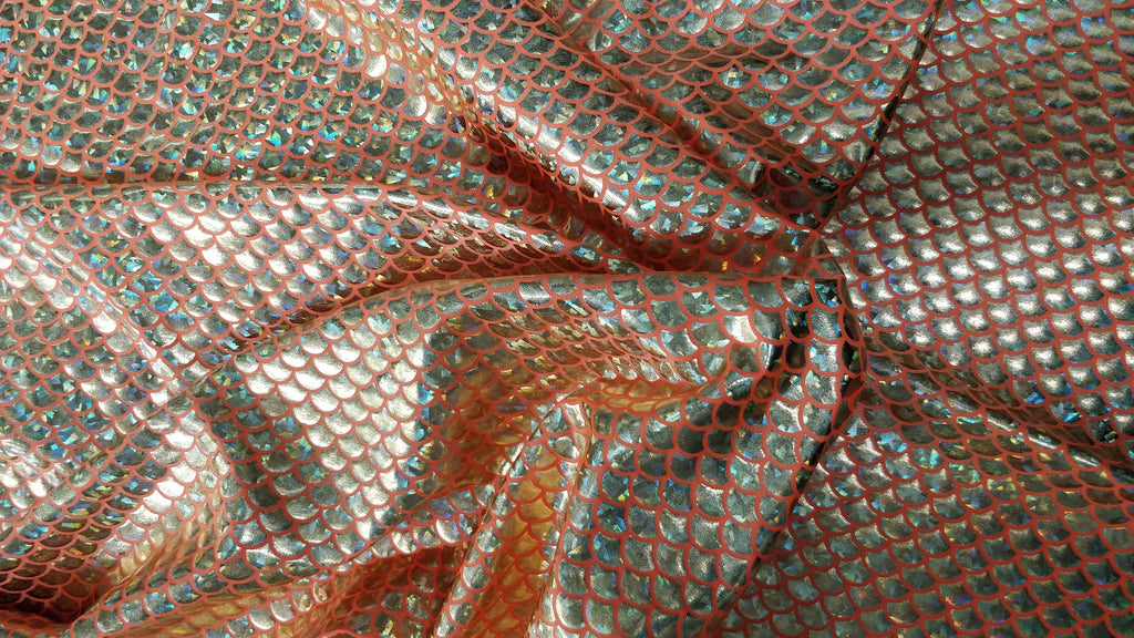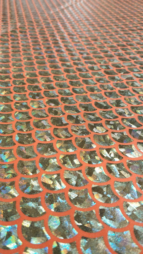 Gold & Orange Mermaid Fish Scale on Hologram Foil Spandex w/ Dots Fabric (4 Way Stretch/Per Yard)