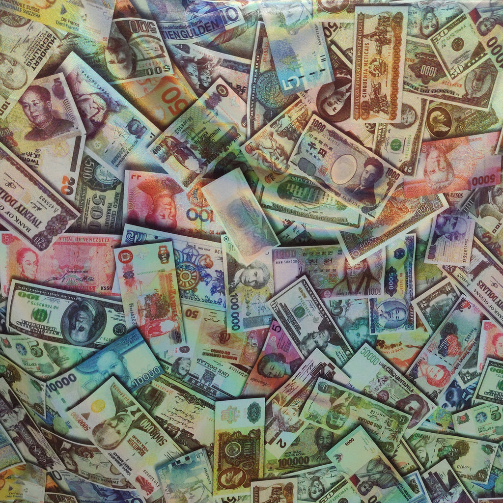 This is a special one off print of our international currency print collection in just a holographic print. It's a combination of some world currencies splayed out on top of each other. Our fabric is top notch quality as always!