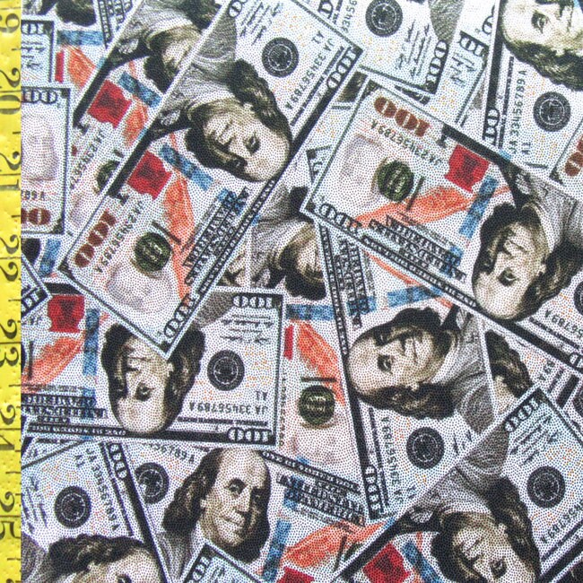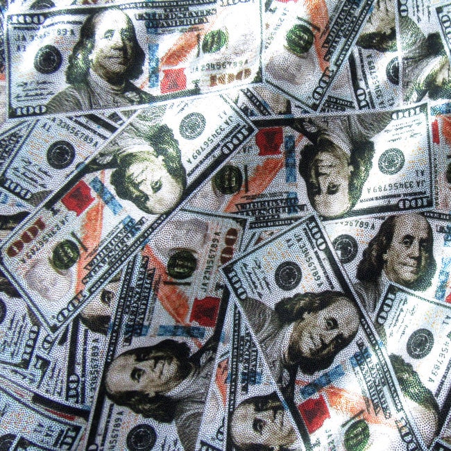 This is a special one off print of our money print collection in just a holographic print. It's a $100 dollar print splayed out on top of each other. The print has a beautiful shiny silver dots on it. Our fabric is top notch quality as always!
