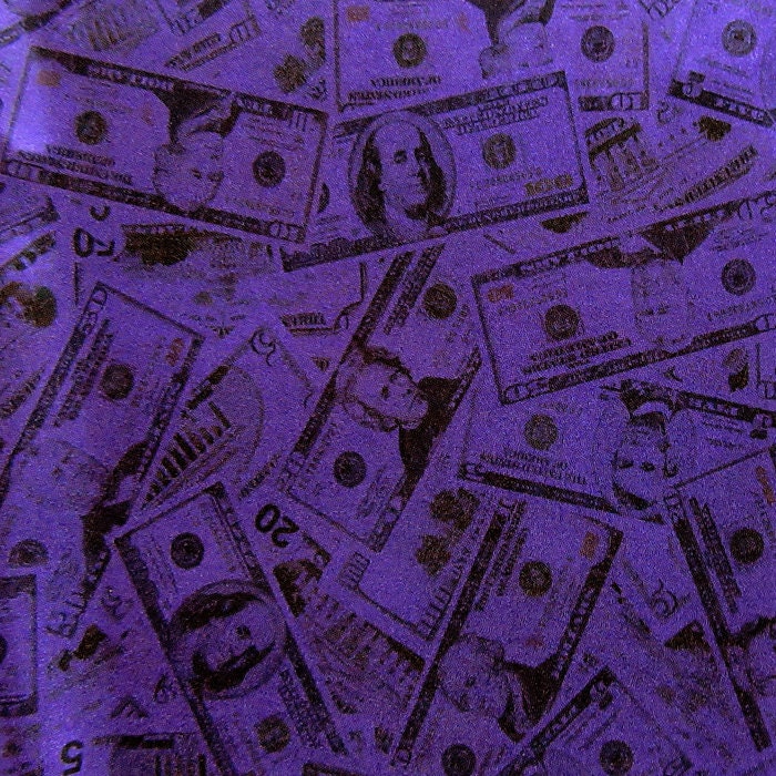 Holographic Money Print (Mixed Bills) with Purple Shiny Dots on Poly Spandex Fabric (Purple) (4 Way Stretch/Per Yard)