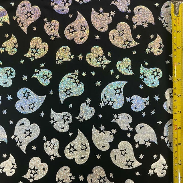 Holographic Sparkly Hearts on Poly Spandex Fabric (Silver/Black) (4 Way Stretch/Per Yard)