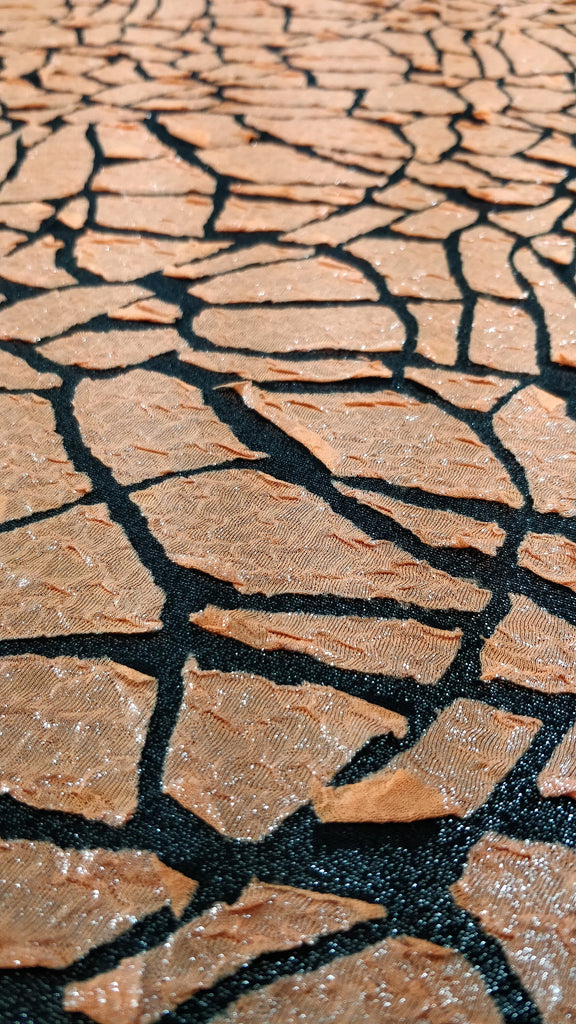We have a unique pattern here and it's a beautiful standout. The laser cut incorporates silver metallic foil, a neon orange laser cut, and merges that on a black poly spandex background. This is definitely a beautiful stand alone in any project you're working on.