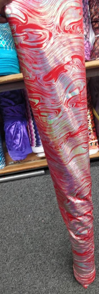 The metallic lava swirl is one of our newly added items and it provides a beautiful visual depth. It incorporates metallic foil on a nylon spandex base for that extra stretch for any project. The unique design of the fabric makes it a stand out. If you're planning on making an item to grab peoples eye this fabric won't let you down. Again its bright appearance makes this fabric a MUST-HAVE!!