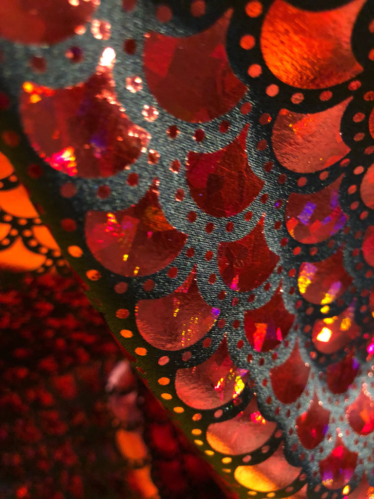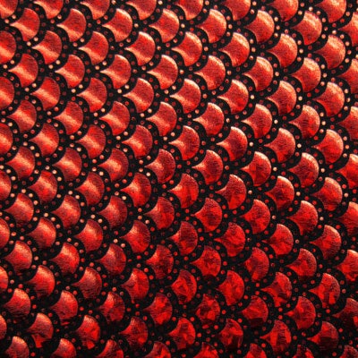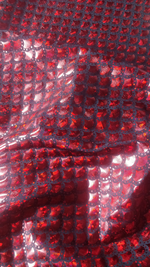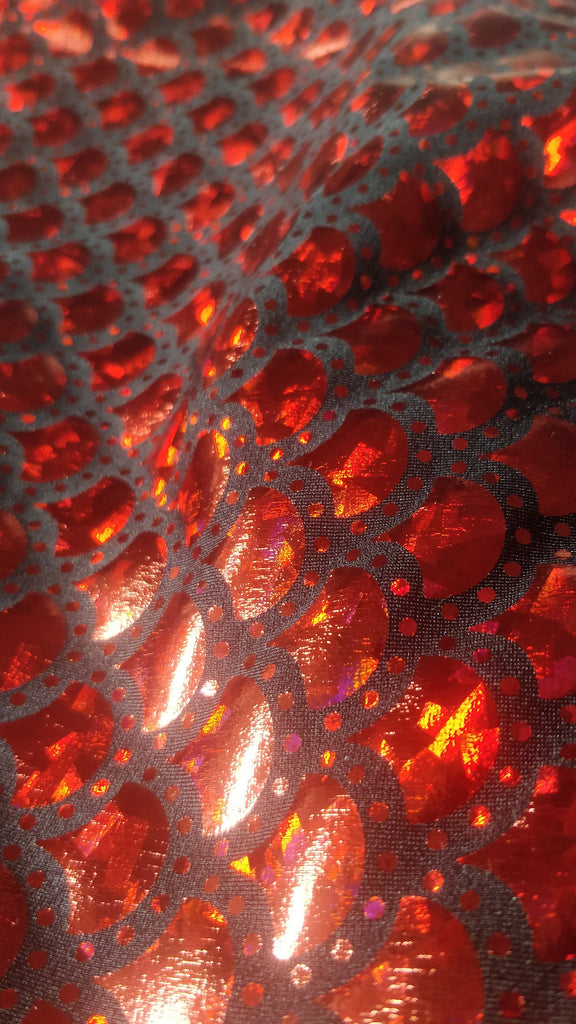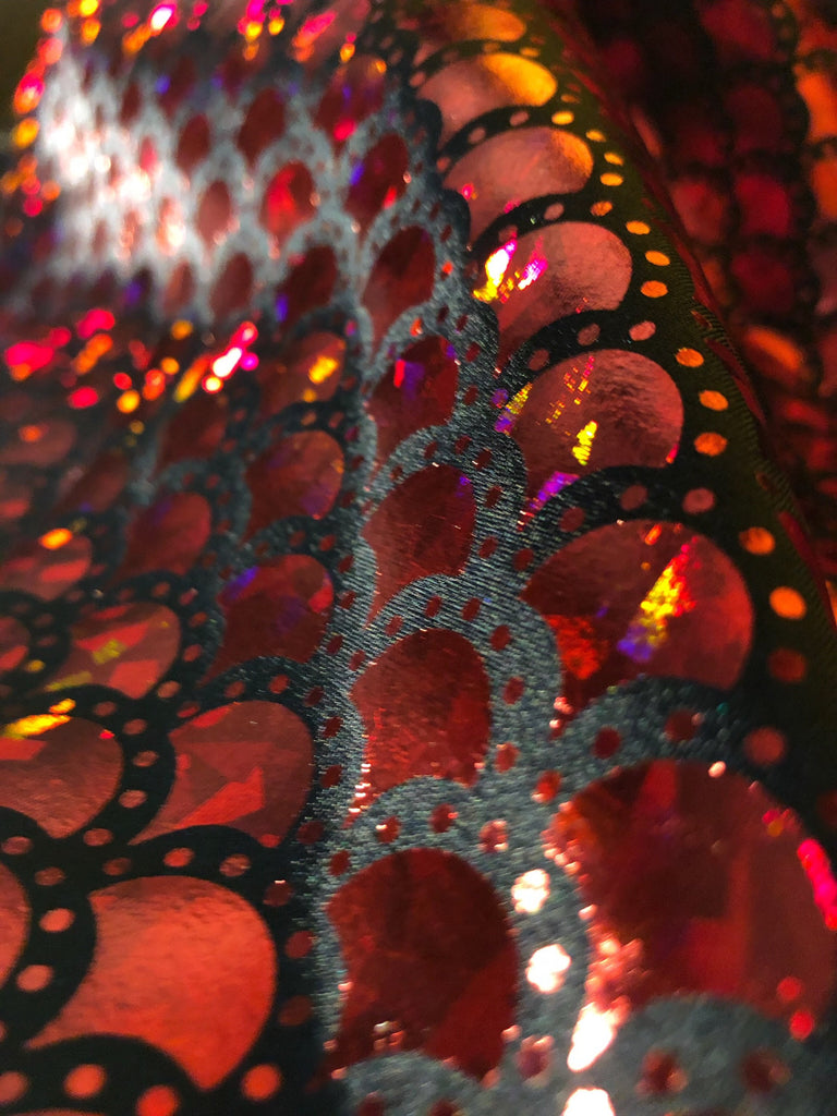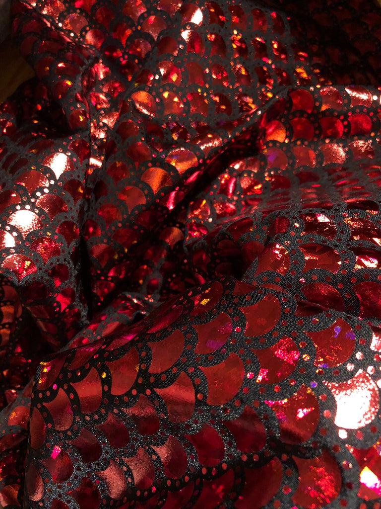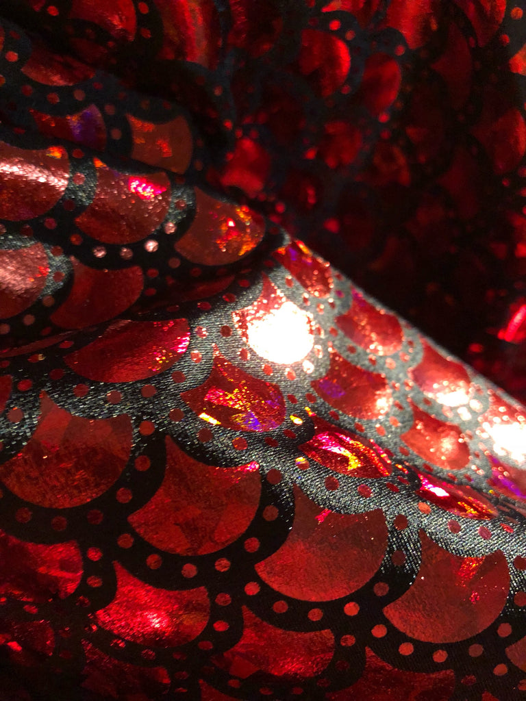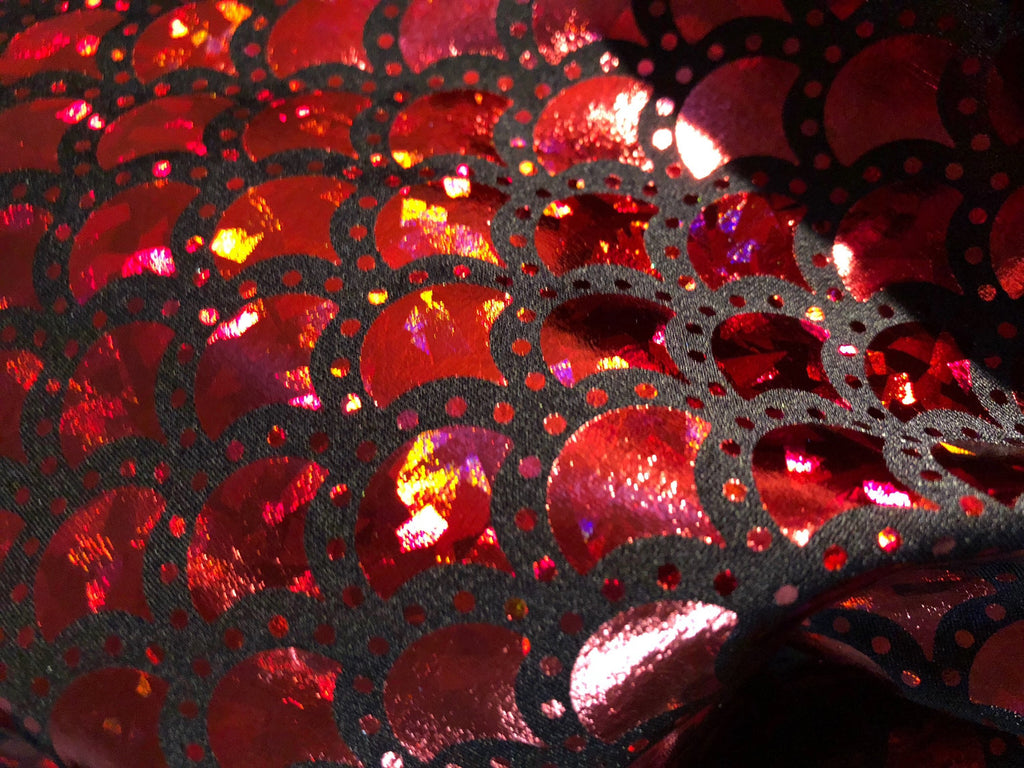 Red & Black Mermaid Fish Scale on Hologram Foil Spandex w/ Dots Fabric (4 Way Stretch/Per Yard)