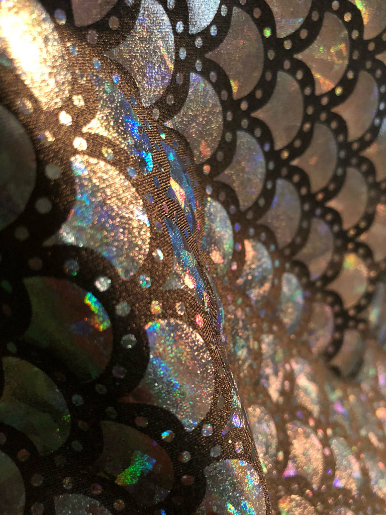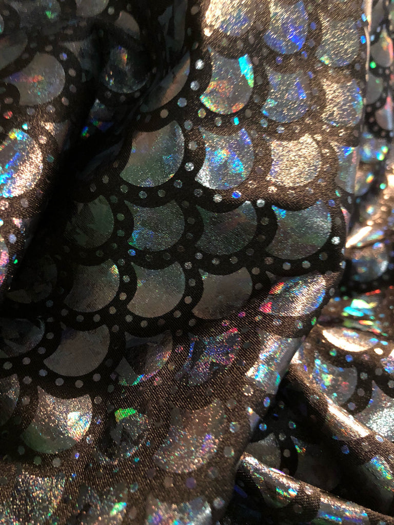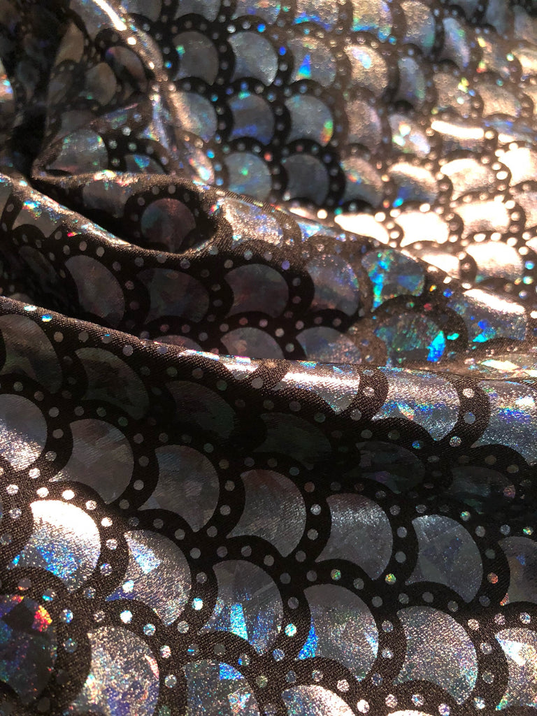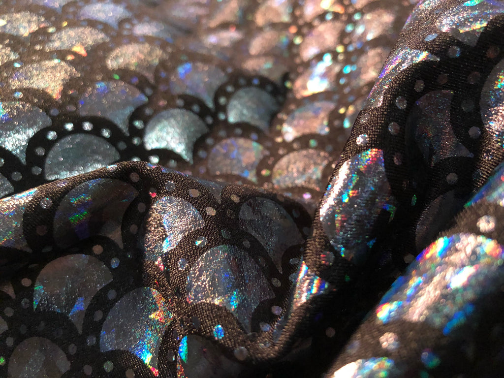 Silver & Black Mermaid Fish Scale on Hologram Foil Spandex w/ Dots Fabric (4 Way Stretch/Per Yard)