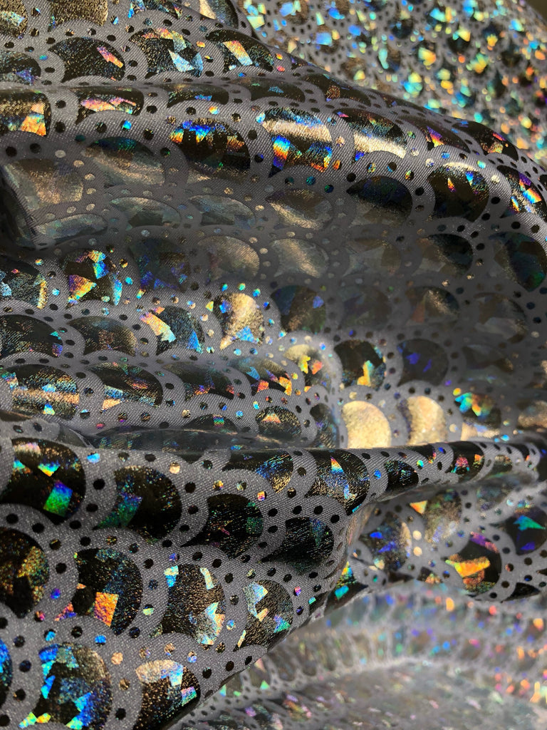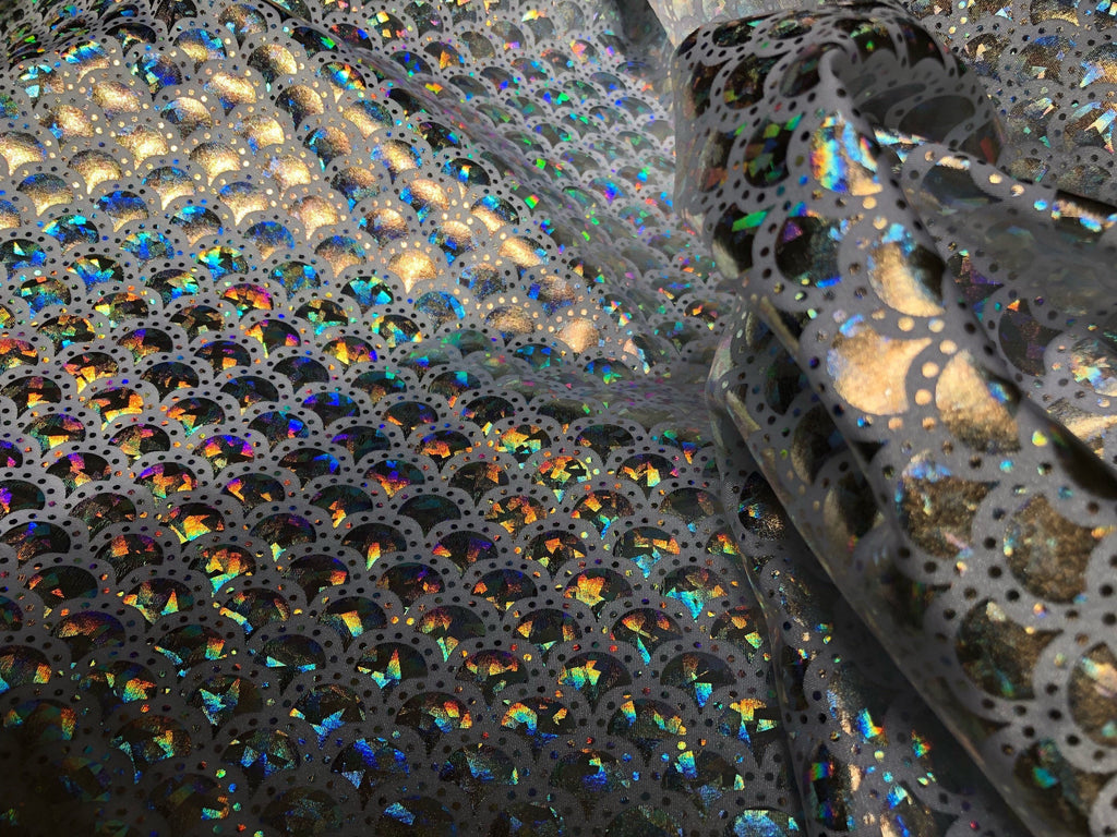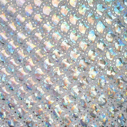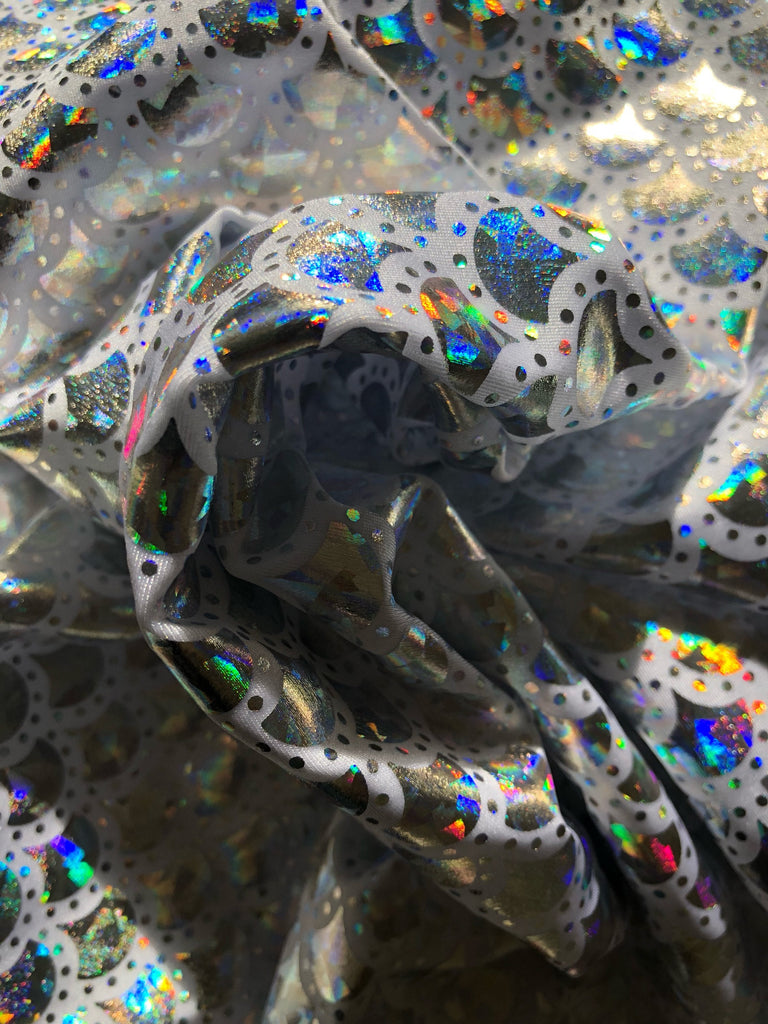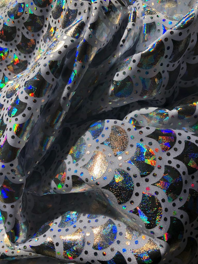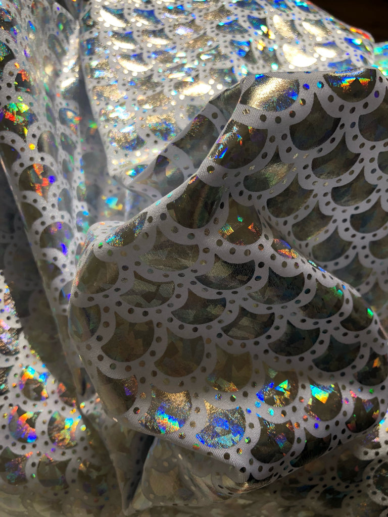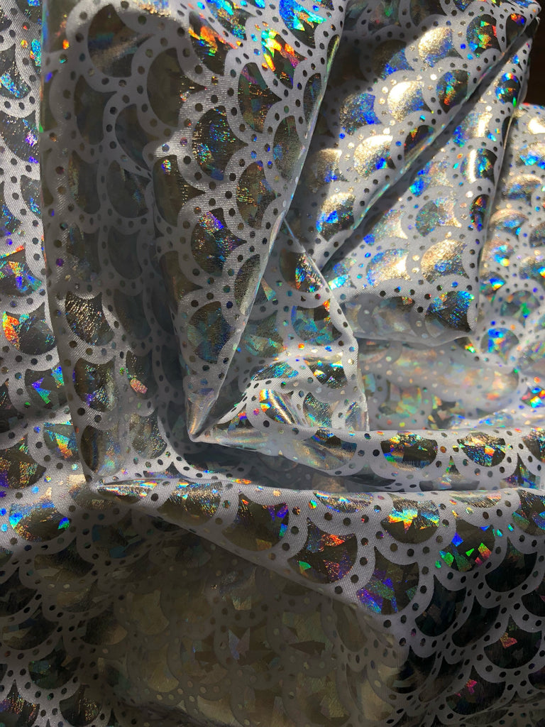 Silver & White Mermaid Fish Scale on Holographic Foil Spandex with Dots Fabric (4 Way Stretch/Per Yard)