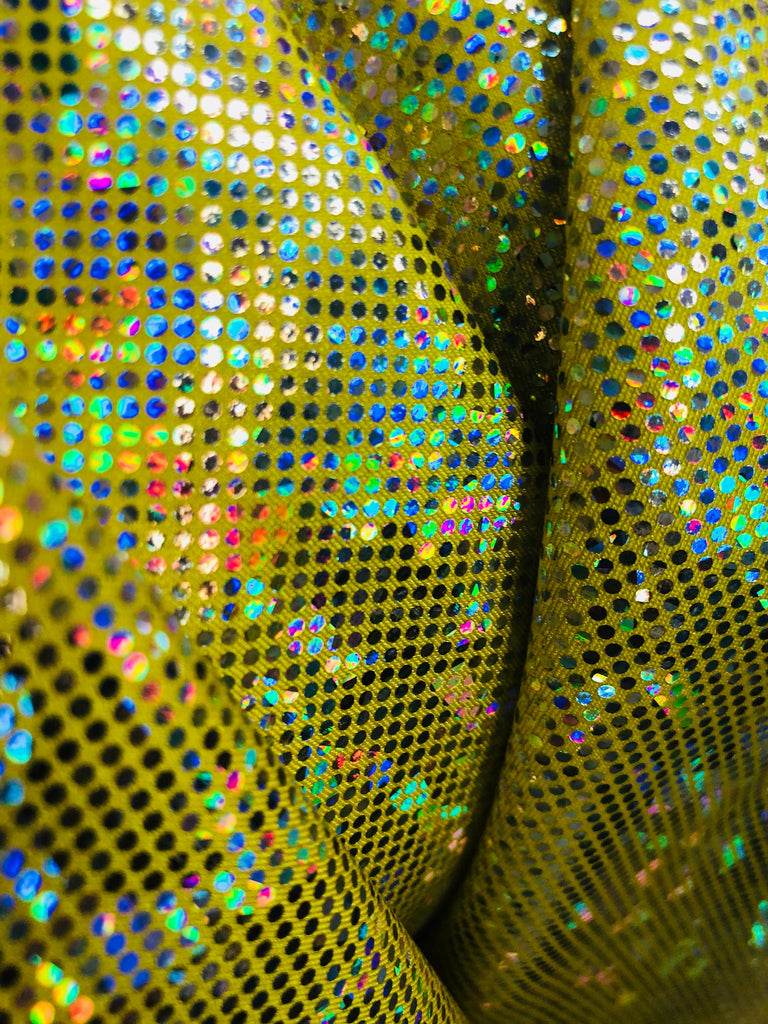 Silver & Yellow Shattered Glass w/ Holographic Foil Spandex Fabric (4 Way Stretch/Per Yard)
