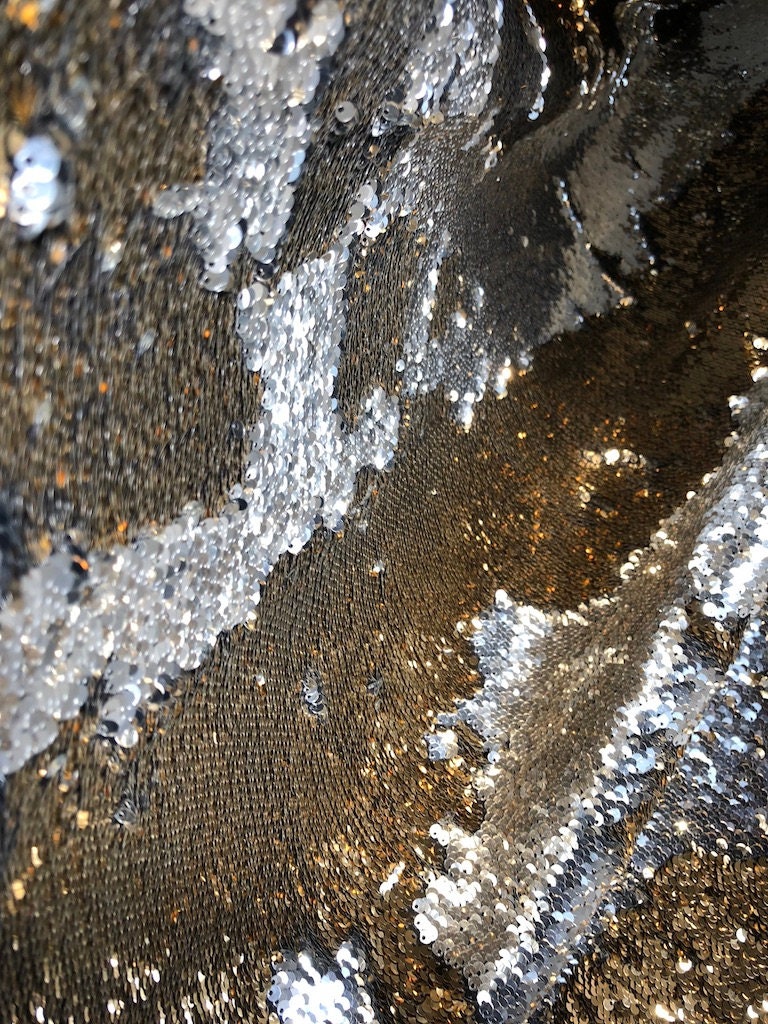 An absolutely stunning luxurious reversible fabric that is made up of hundreds of circular sequins, with a metallic silver on one side, and a rich, glossy gold on the other. You can stroke the sequins either way for whatever look you want; you can even use your finger to draw designs into it. This beautiful material is sure to turn heads at any special event.