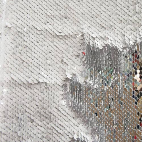 An absolutely stunning luxurious reversible fabric that is made up of hundreds of circular sequins, with a metallic silver on one side, and a rich, glossy white on the other. You can stroke the sequins either way for whatever look you want; you can even use your finger to draw designs into it! This beautiful material is sure to turn head on the red-carpet or at your special event.