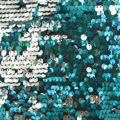 An absolutely stunning luxurious reversible fabric that is made up of hundreds of circular sequins, with a metallic silver on one side, and a rich, glossy turquoise on the other. You can stroke the sequins either way for whatever look you want; you can even use your finger to draw designs into it! This beautiful material is sure to turn head on the red-carpet or at your special event.
